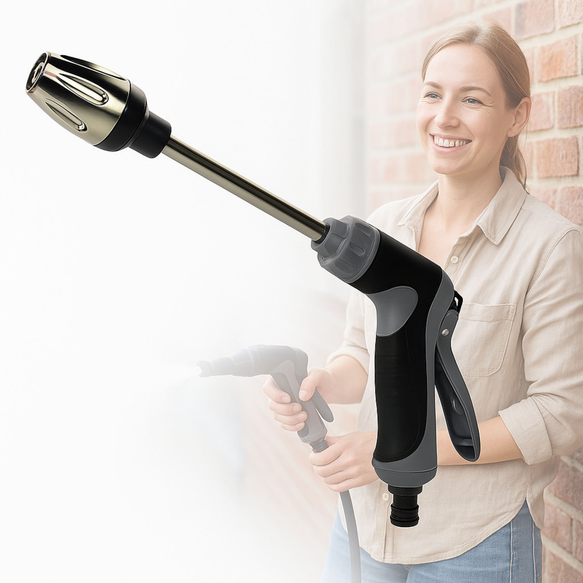 Der robuste Edelstahlkern und die doppelte Düsensteuerung erzeugen gemeinsam einen gezielten Hochdruckstrahl – komplett ohne Strom! Gleichzeitig sorgt die 360°-Drehfunktion für maximale Flexibilität bei jeder Anwendung. Der rutschfeste, verstärkte Griff liegt perfekt in der Hand – auch bei Nässe.