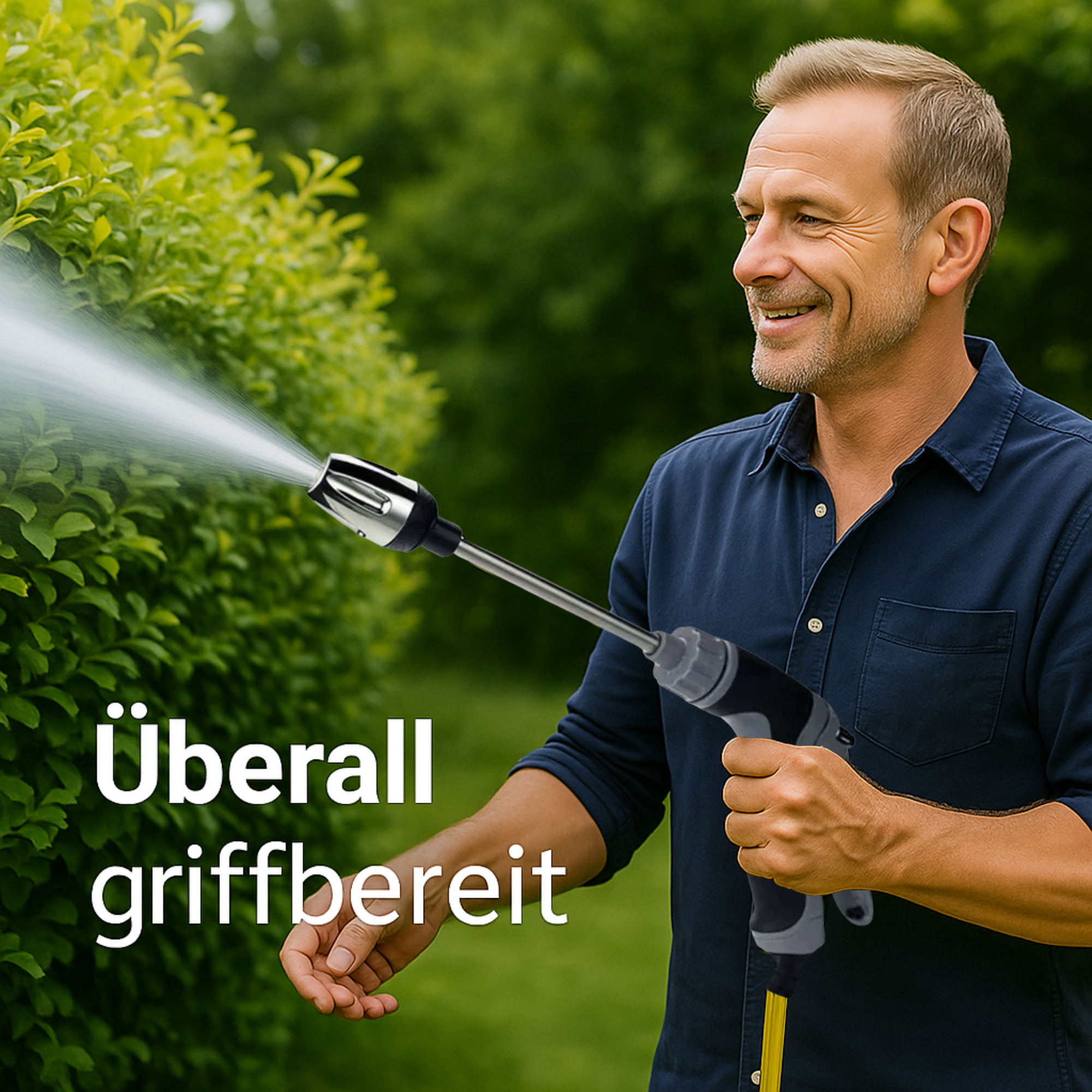 Einfach auf den Gartenschlauch aufschrauben, Wasserdruck einstellen – und direkt loslegen.