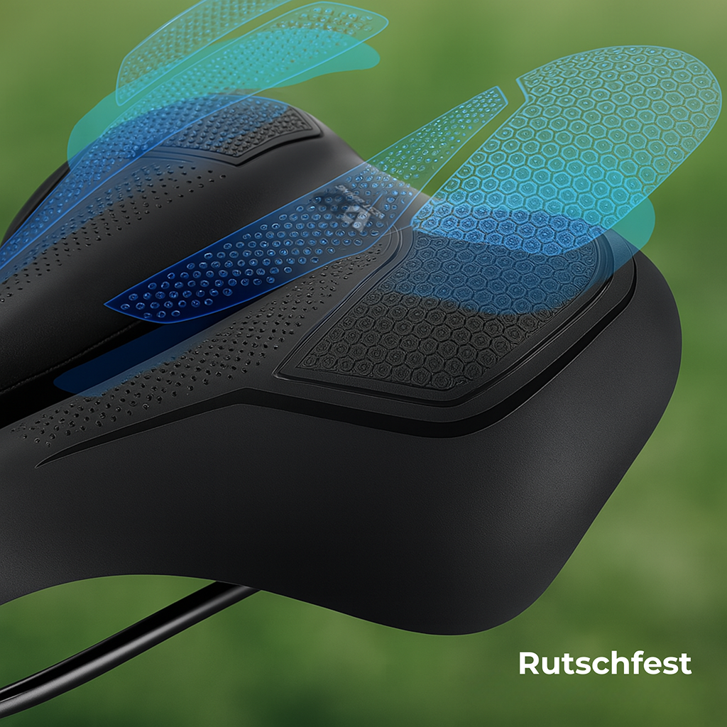 Wasserabweisender Bezug und rutschfestes Material machen jedes Wetter mit – du bleibst sicher im Sattel.