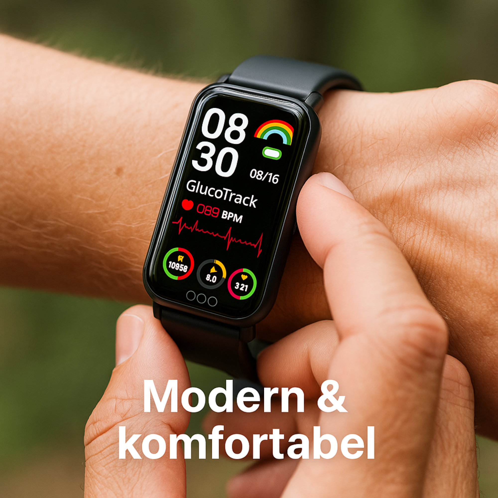 Der moderne IPS-Touchscreen zeigt dir deine Gesundheitsdaten gestochen scharf. Die GlucoTrack ist leicht, robust und angenehm zu tragen. Dank IP68-Schutz trotzt sie Regen und Staub, während Bluetooth 5.0 für stabile Verbindung sorgt.