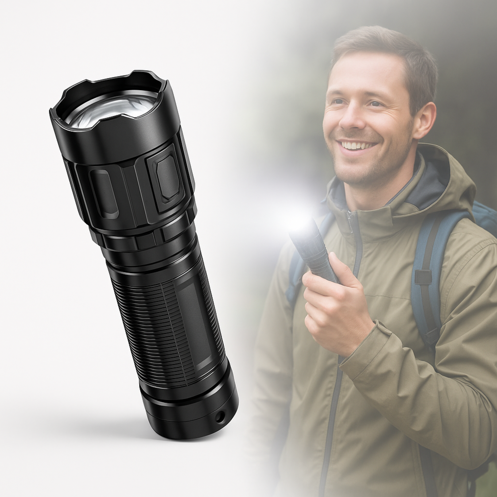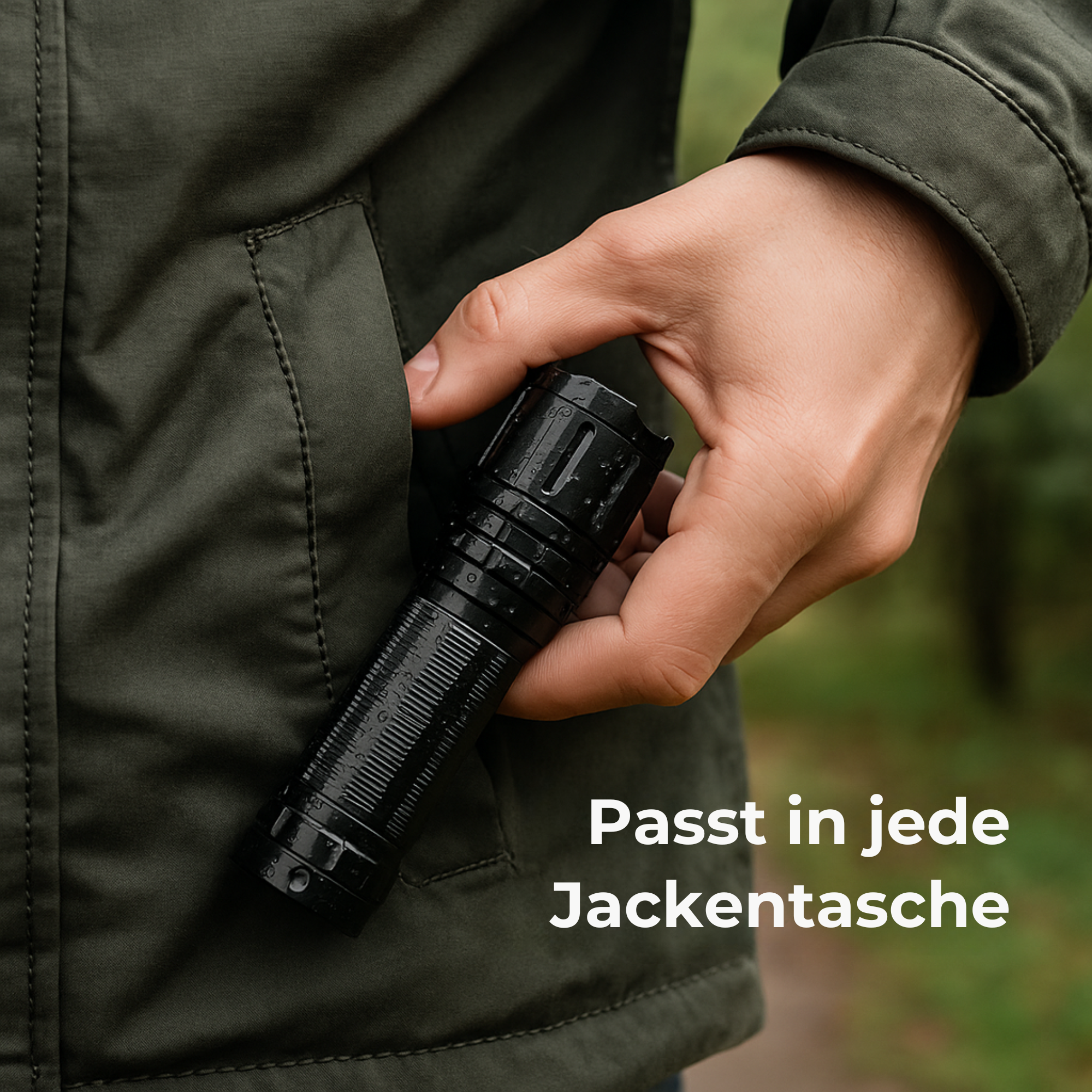 Viele Taschenlampen versagen bei Regen oder Kälte. Die LumenGuard ist IPX6-zertifiziert, wasserfest und gebaut für raue Bedingungen. Selbst bei Schneeregen oder Nebel strahlt sie hell – damit du nie im Dunkeln stehst.