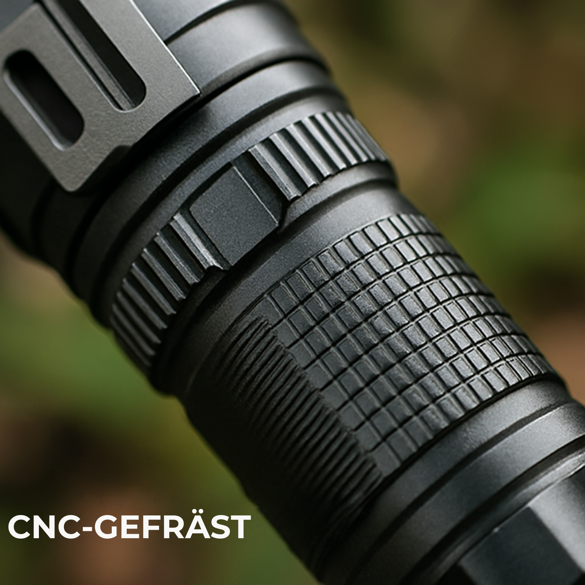 Das CNC-gefräste Aluminiumgehäuse macht LumenGuard extrem langlebig – und dennoch angenehm leicht. Der USB-C-Anschluss sorgt für schnelles Aufladen, und die 5 Lichtmodi lassen sich bequem per Knopfdruck wechseln. Ob Nahbereich oder Fernlicht – du entscheidest.