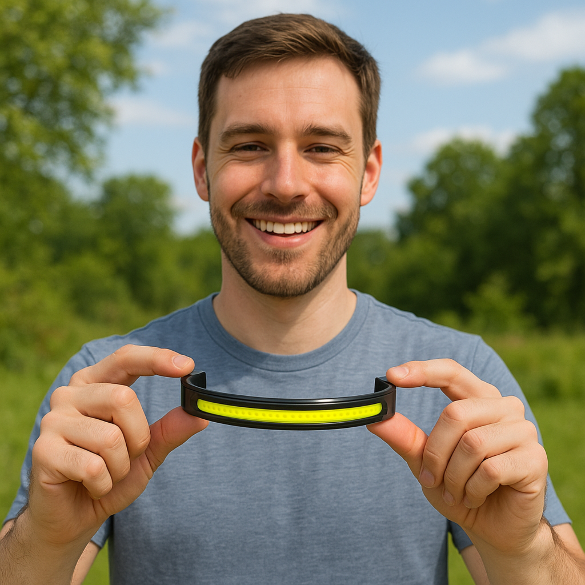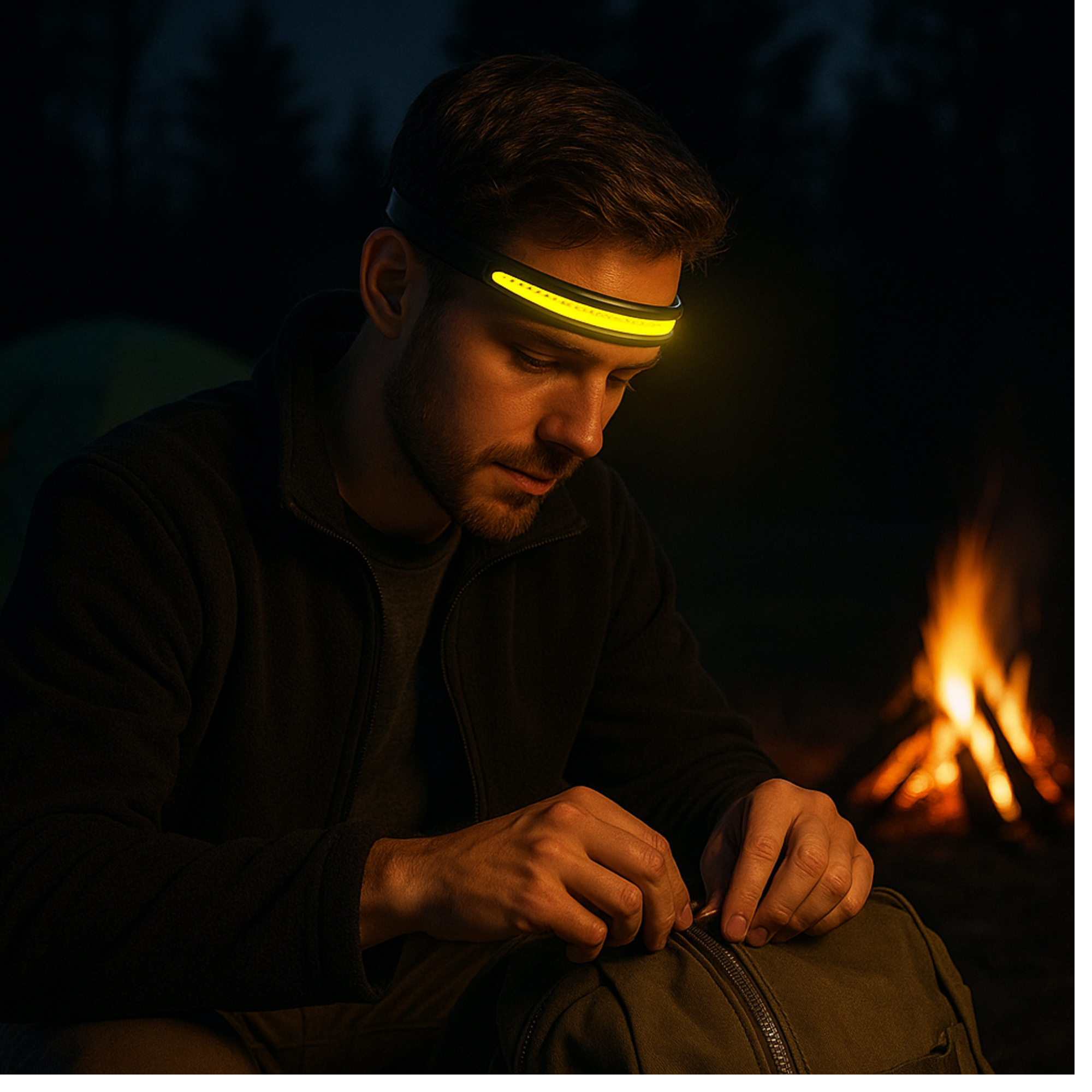 Die Stirnlampe nutzt ein breites COB-LED-Lichtband, das deinen gesamten Sichtbereich ausleuchtet.
