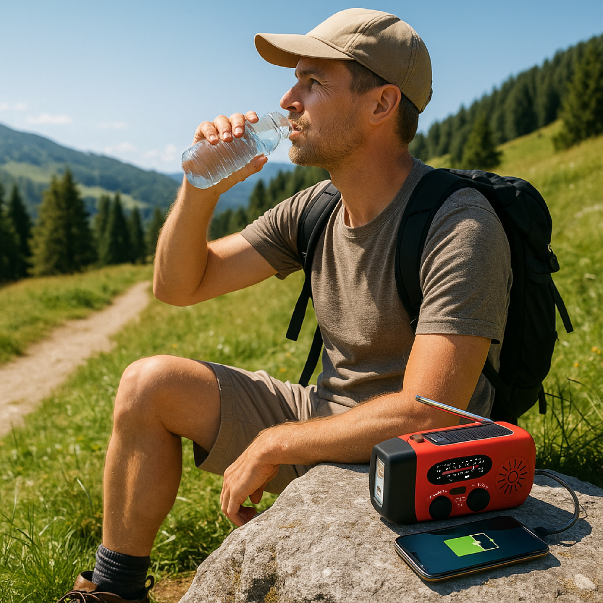 Nein – du brauchst keine Ersatzbatterien. Dank Kurbel und Solar bist du vollkommen unabhängig.