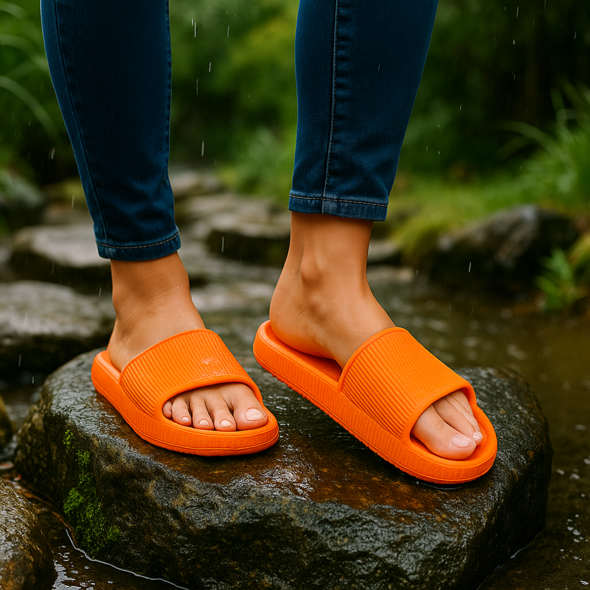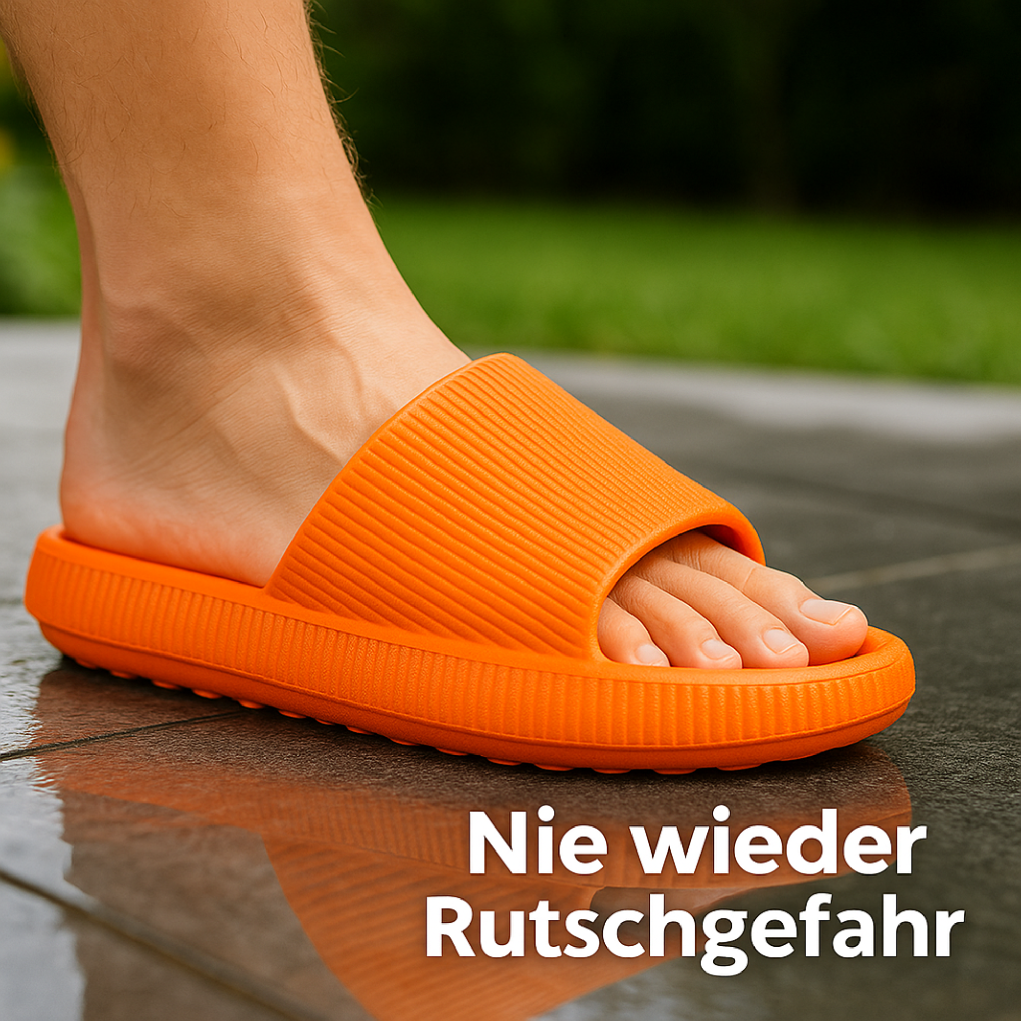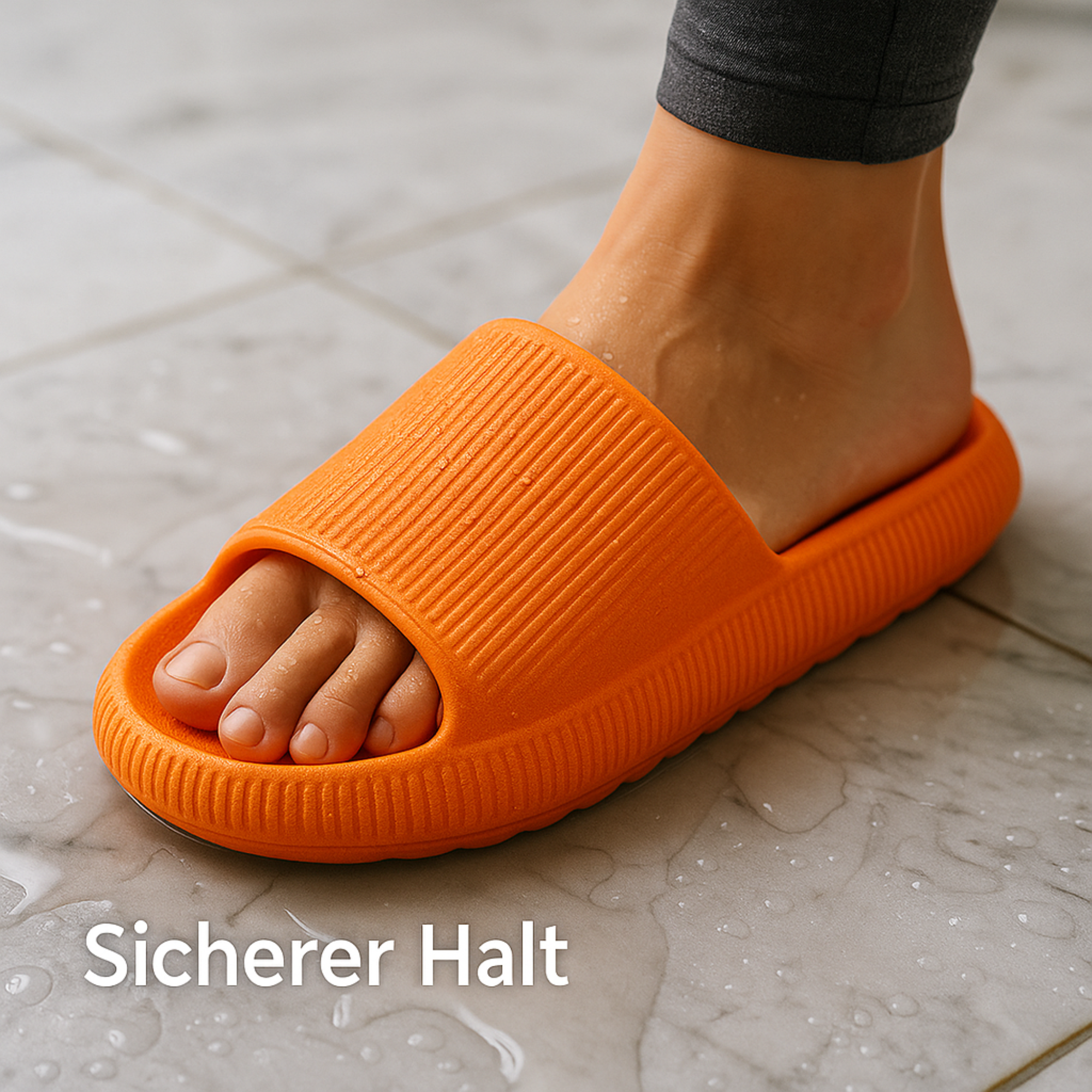 Nasse Böden im Bad, auf dem Balkon oder beim Gießen im Garten sind oft rutschig und gefährlich. WohlTritt sorgt mit seiner griffigen, rutschfesten Sohle für sicheren Stand – selbst auf glattem Marmor oder nassem Holz. So hast du jederzeit sicheren Halt – ob im Haus oder draußen.